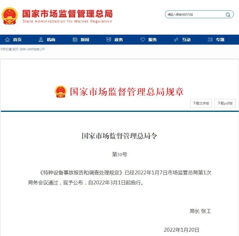 特種設(shè)備事故報(bào)告和調(diào)查處理規(guī)定 (2022年1月20日國家市場(chǎng)監(jiān)督管理總局令第50號(hào)公布,自2022年3月1日起施行)