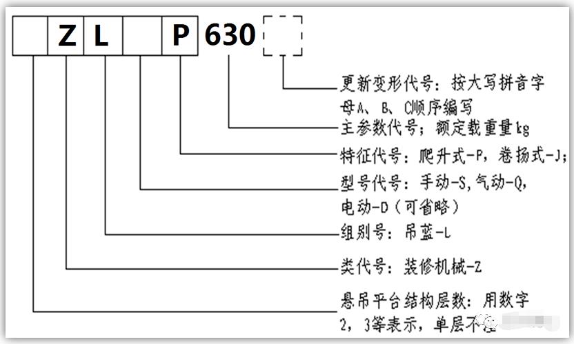 4、高處作業(yè)吊籃型號(hào) 高處作業(yè)吊籃型號(hào)是由類(lèi)、組、型代號(hào)、特征代號(hào)和主要代號(hào)及更新型代號(hào)組成。