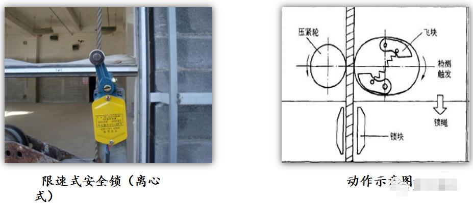 8、高處作業(yè)吊籃安全鎖 安全鎖按其工作原理,可分為離心觸發(fā)式和擺臂防傾式兩類(lèi)。 離心觸發(fā)式:當(dāng)?shù)趸@的下降速度超過(guò)一定數(shù)值,飛塊產(chǎn)生的離心力克服彈簧的約束力向外甩到一定程度時(shí),觸動(dòng)等待中的執(zhí)行元件,帶動(dòng)鎖繩機(jī)構(gòu)動(dòng)作,將鎖塊鎖緊在安全鋼絲繩上。