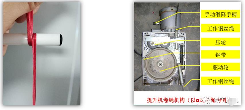7、高處作業(yè)吊籃工作原理 電動(dòng)提升機(jī)工作原理: 吊籃提升機(jī)構(gòu)的基本原理,如同在筆上纏一圈繩后,向上拉緊繩的情況下,旋動(dòng)筆時(shí),筆會(huì)上下移動(dòng)。 提升機(jī)不是收卷或釋放鋼絲繩,而是靠驅(qū)動(dòng)輪與工作鋼絲繩之間的咬合摩擦,工作時(shí)鋼絲繩靜止不動(dòng),驅(qū)動(dòng)輪在其上爬行,從而帶動(dòng)提升機(jī)及懸吊平臺(tái)整體提升。
