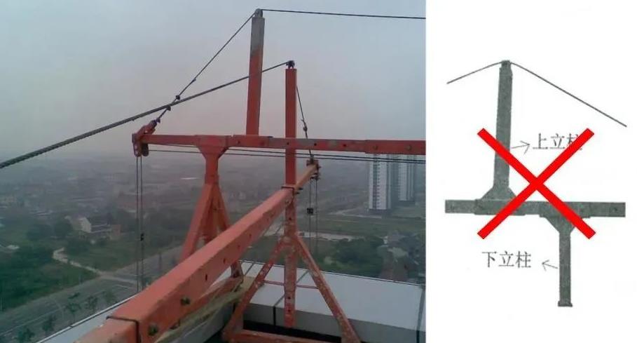 ▲吊籃前支架與上立柱未處于同一垂直線(xiàn),錯(cuò)誤