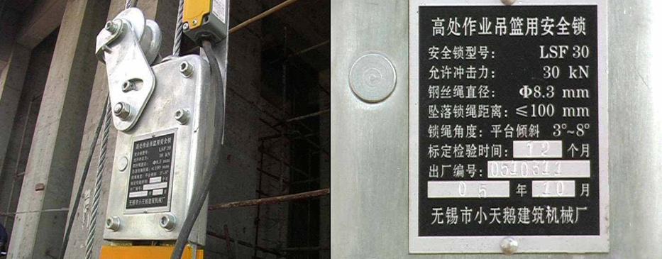 吊籃應(yīng)安裝防墜安全鎖,銘牌清晰,鎖具靈敏有效,安全鎖不應(yīng)超過(guò)標(biāo)定期限。吊籃應(yīng)安裝上限位裝置,并應(yīng)保證限位裝置靈敏可靠。