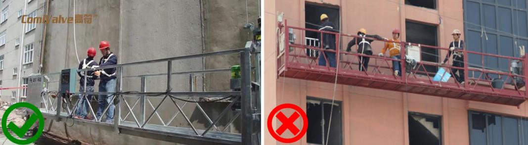 吊籃內(nèi)的作業(yè)人員不應(yīng)超過(guò) 2 人,吊籃內(nèi)作業(yè)人員應(yīng)將安全帶用安全鎖扣正確掛置在獨(dú)立設(shè)置的專(zhuān)用安全繩上。