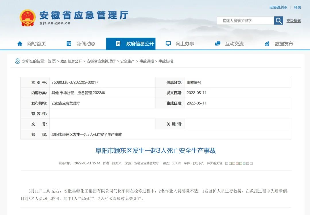 據(jù)安徽省應(yīng)急管理廳網(wǎng)站消息:5月11日11時(shí)左右,安徽昊源化工集團(tuán)有限公司氣化車(chē)間在檢修過(guò)程中,2名作業(yè)人員感覺(jué)不適,1名監(jiān)護(hù)人員進(jìn)行救援,在救援過(guò)程中先后暈倒。目前3名人員均已救出,其中1人當(dāng)場(chǎng)死亡,2人經(jīng)醫(yī)院搶救無(wú)效死亡。