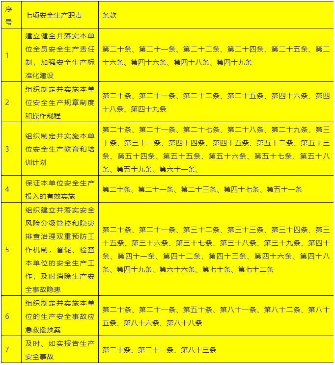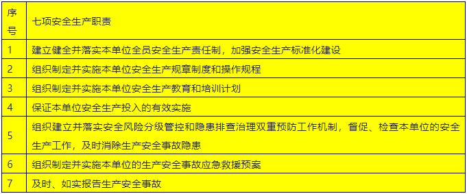 企業(yè)主要負(fù)責(zé)人法定七項(xiàng)安全生產(chǎn)職責(zé)內(nèi)容見下表: