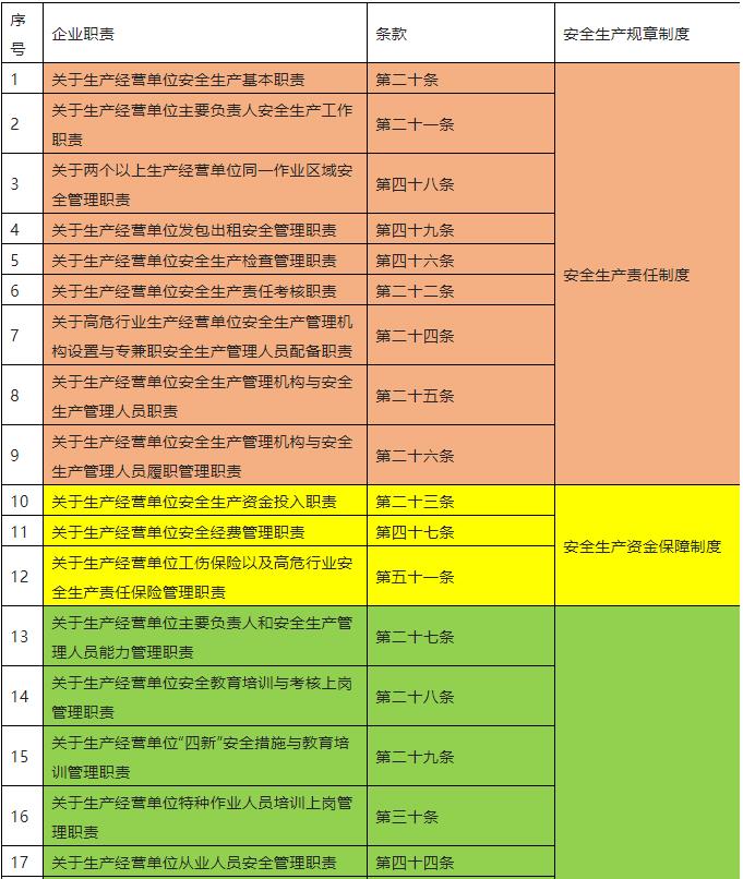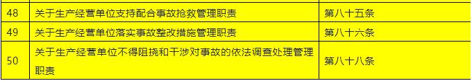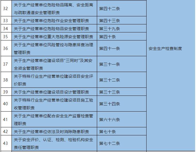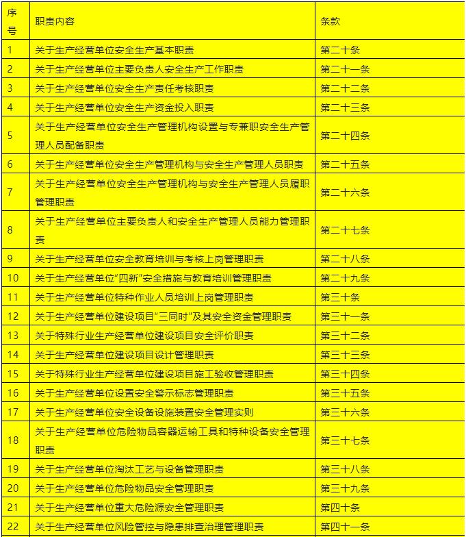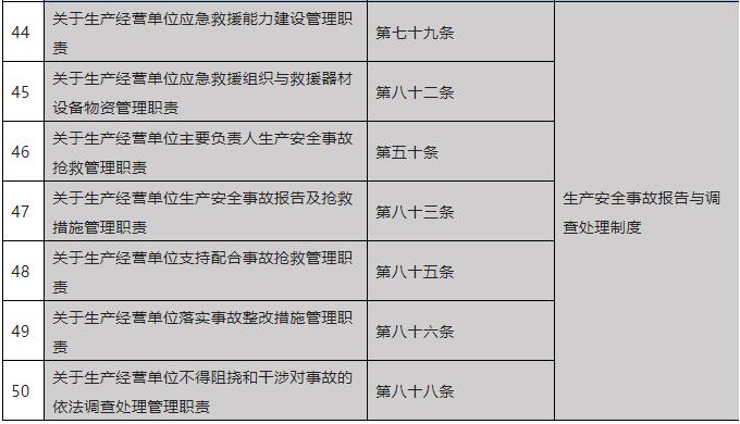 生產(chǎn)經(jīng)營單位主要負(fù)責(zé)人七項(xiàng)安全生產(chǎn)職責(zé)與生產(chǎn)經(jīng)營單位安全生產(chǎn)“50條職責(zé)”存在對應(yīng)的關(guān)系,如下表所示: 七項(xiàng)安全生產(chǎn)職責(zé)與50條職責(zé)對照關(guān)系分析表