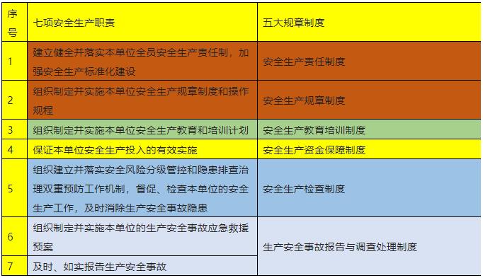 以生產(chǎn)經(jīng)營單位主要負(fù)責(zé)人七項(xiàng)安全生產(chǎn)職責(zé)來講,亦可歸納為五大制度,均可歸結(jié)為安全生產(chǎn)規(guī)章制度,如下表所示: 七項(xiàng)安全生產(chǎn)職責(zé)與安全生產(chǎn)“五大規(guī)章制度”關(guān)系對照表