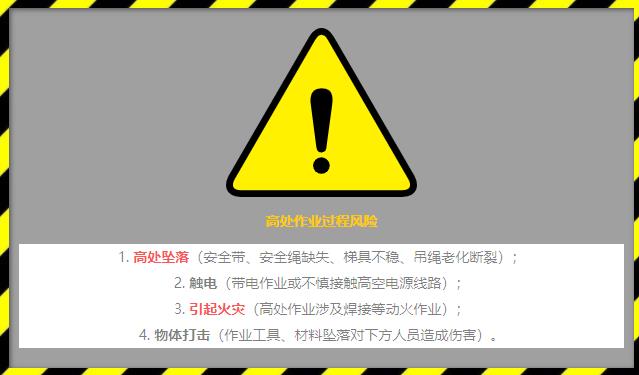 高處作業(yè)主要包括臨邊、攀登、懸空、交叉、洞口等五種基本類型,這些類型的高處作業(yè)是高處作業(yè)傷亡事故可能發(fā)生的主要地點。高處作業(yè)活動面小、四周臨空,且交叉作業(yè)多,是一項復(fù)雜的危險工作,稍有疏忽,就可能造成高處墜落或物體打擊事故!