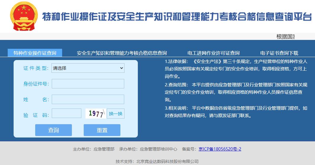 三、高處作業(yè)人員資質(zhì)查驗 高處作業(yè)人員須先進行高處作業(yè)報名培訓(xùn),必須經(jīng)安全教育并考試合格,取得高處作業(yè)的相應(yīng)特種作業(yè)操作證。登錄《中華人民共和國應(yīng)急管理部》官方網(wǎng)站-特種作業(yè)操作證及安全生產(chǎn)知識和管理能力考核合格信息查詢平臺(https://www.mem.gov.cn/fw/cxfw/),可查詢證件有效性。