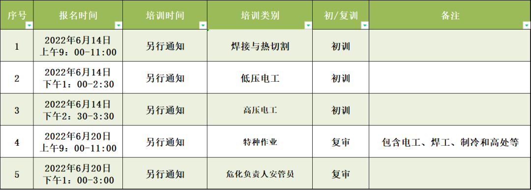 線下報名所需資料 1.特種作業(yè)復(fù)訓(xùn) (1)報名申請表;(2)身份證原件;(3)1寸照片一張;(4)報名時請攜帶特種作業(yè)操作證原件。 2.危化負(fù)責(zé)人安管員復(fù)訓(xùn) (1)填寫并提交《危險物品生產(chǎn)經(jīng)營單位主要負(fù)責(zé)人、安管員安全培訓(xùn)申請登記表》,需由申請人簽字確認(rèn),并加蓋單位公章; (2)報名時請攜帶身份證原件;(3)二寸免冠照1張;(4)公司營業(yè)執(zhí)照復(fù)印件;(5)復(fù)訓(xùn)人員需攜帶考核合格證件原件。 3.特種作業(yè)初訓(xùn)(焊工、電工) (1)報名申請表;(2)身份證原件;(3)一張1寸照片;(4)初中及以上學(xué)歷證明復(fù)印件一份(或者戶口本本人頁復(fù)印件(含文化程度))。 報名咨詢電話:89261287,87231009。
