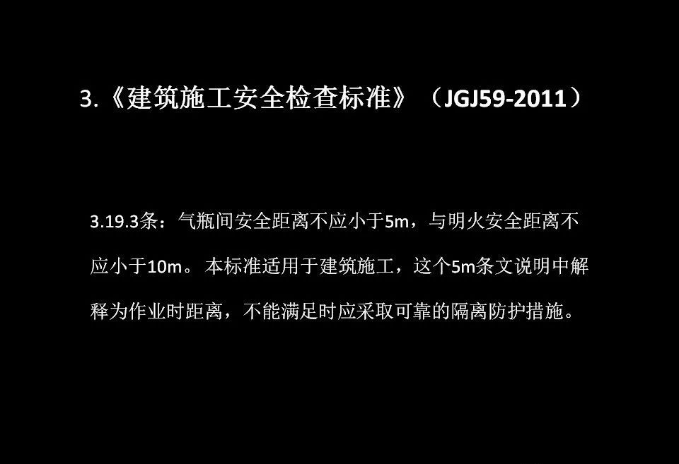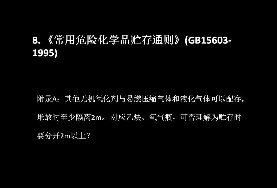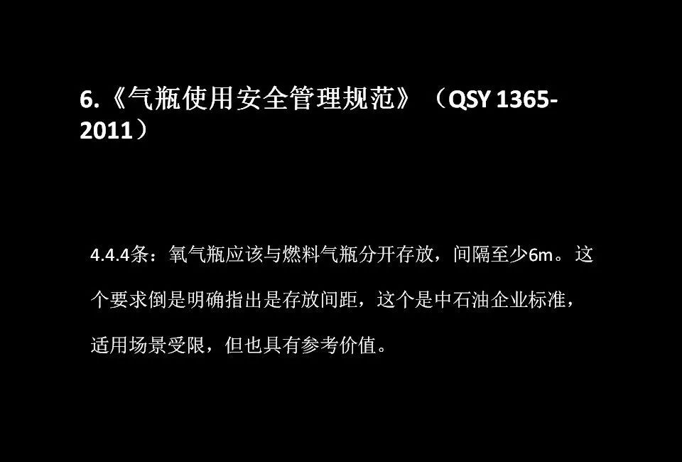綜上,各個標準規(guī)定不盡相同,每個標準都有其適用范圍,除去建筑、電力、化工這些行業(yè)另有規(guī)定,在一般工貿行業(yè),可適用《焊接與切割安全》和《常用危險化學品貯存通則》,則乙炔、氧氣瓶之間存放距離不低于2m,氣瓶與明火距離5m以上。