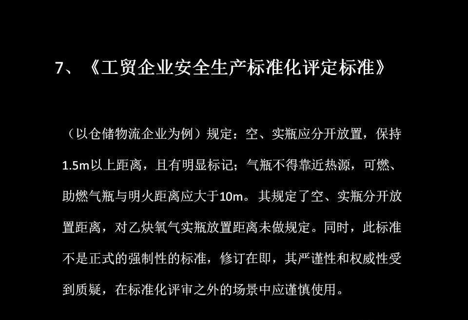 《氣瓶搬運裝卸儲存使用安全規(guī)定》(GB34525-2017)未做規(guī)定,是否意味著此距離可繼續(xù)放寬? 而從風險管控的角度看,乙炔和氧氣,一個易燃一個助燃,是必須留有一定安全距離的,根據企業(yè)現場環(huán)境不同和對風險承受能力的不同,企業(yè)適當的從嚴管理是很有必要的。 但在安全生產檢查中,每一條隱患的提出都應有依據作為支撐,對此,必須謹慎對待,并做進一步的研究。